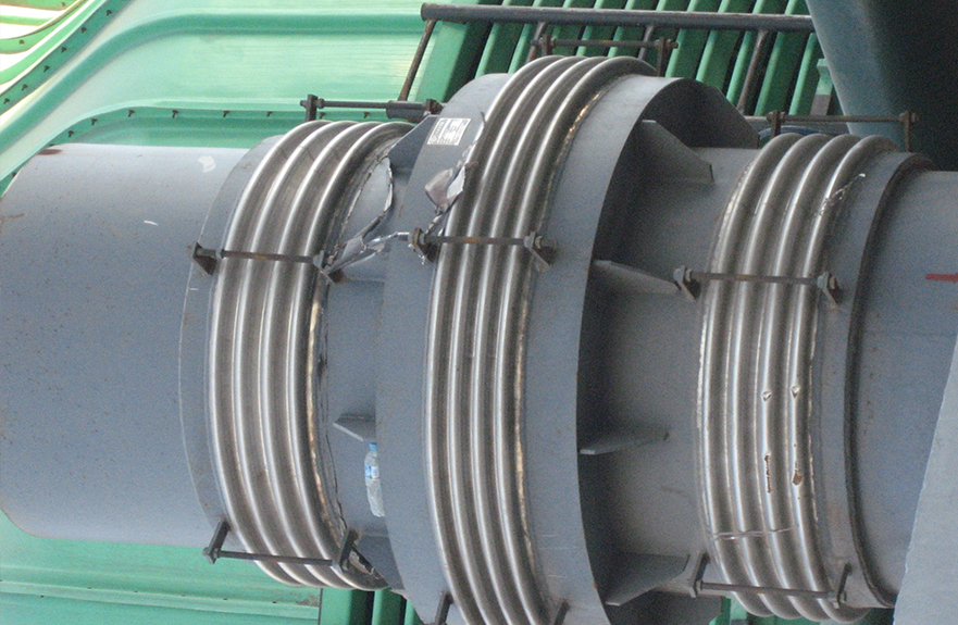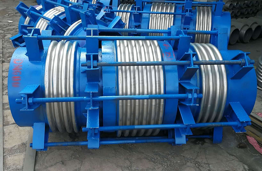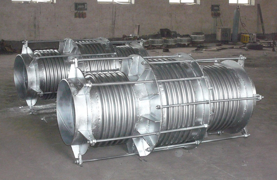該膨脹節的兩端各有一個工作波紋管,中間有一個平衡波紋管,膨脹節通過受力構件(大拉桿或舌管)來承受內壓推力,因此管系只需中間固定支架。此類膨脹節只能吸收軸向位移。